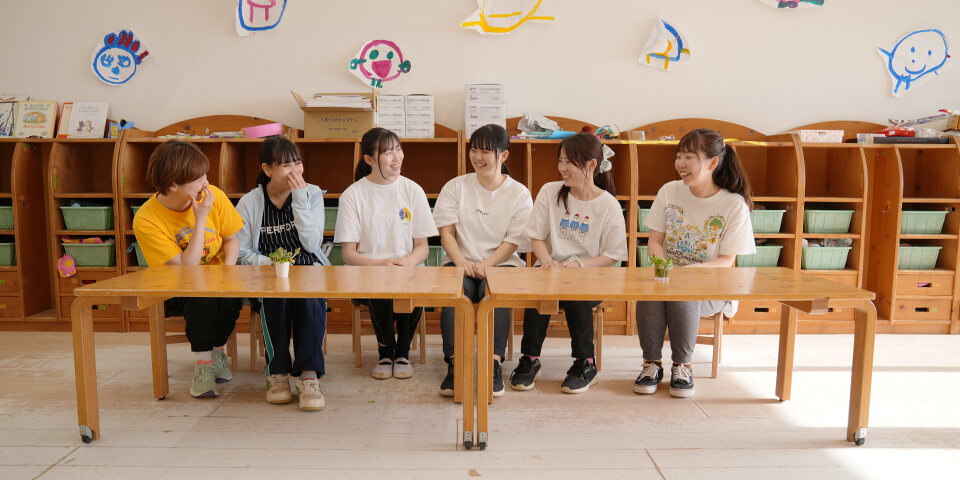 ニューライフ幼稚園で働く先生が6人も集結。陽の光が暖かい年長さんの教室で、和気あいあいと話を咲かせました。